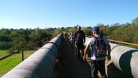 Recorridos aproximadamente 8 kms., llegamos a un singular puente construido sobre el río Gévora para soportar dos enormes tuberías de unos 90 cms. de diámetro que conducen el agua desde la presa Peña del Águila en Villar del Rey hasta la depuradora en Badajoz y que sirve para abastecer a la Ciudad y pueblos colindantes. Una escalera metálica a ambos extremos, sirve para subir y bajar las personas al puente para desplazarse entre las dos tuberías, dejando atrás la finca de “El Rincón de Gila” e internándonos en la Finca “Mesas del Río”, donde volvemos a encontrarnos con cientos de nogales.
